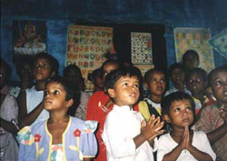 Slowly, word of Little Stars spread among the denizens of Varnasi's poor neighborhoods. And each day, more children showed up, asking her to open doors into the better world she promised them. When the school year ended in May'97 there were 70 children attending, and the rooftop of the Pandey home could no longer fit them all in. At this crucial stage, ASHA, which is dedicated to supporting alternative education in India, stepped in with money to move to a larger space, to begin paying teachers who had previously been volunteering, to purchase more school supplies, and significantly, to provide nutritious food for the children on a daily basis.